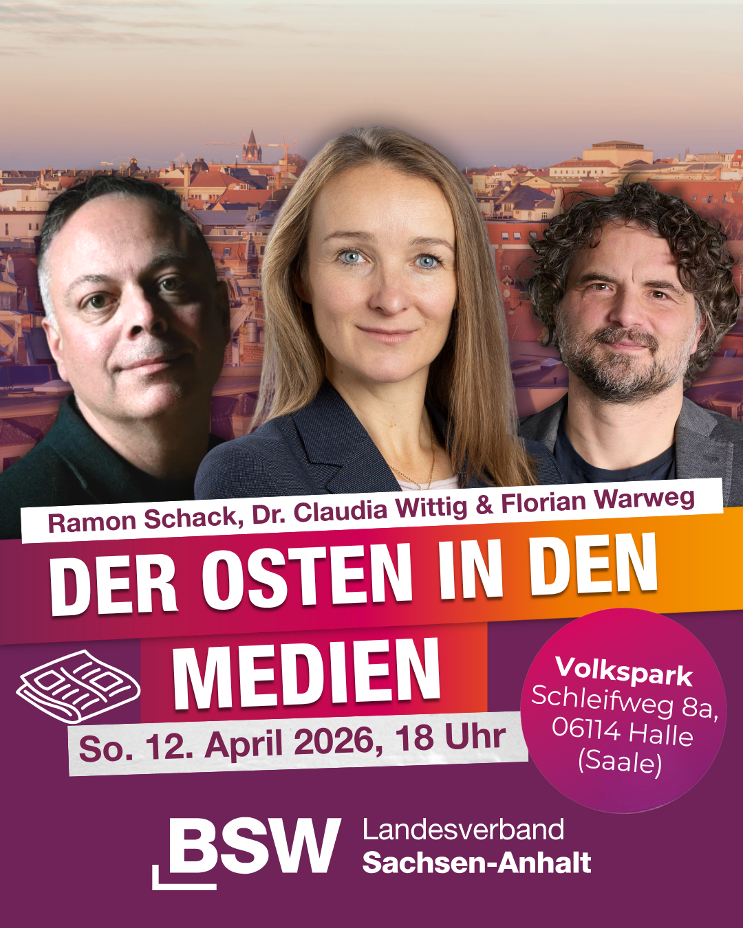 Aktuelles – Am 8. März wählten wir in Magdeburg unsere Liste zur Wahl zum 9. Landtag von Sachsen-Anhalt am 6. September 2026. Folgende Bewerber treten für das BSW auf der Landesliste an: 1. Thomas Schulze  2. Dr. Claudia Wittig  3. Margitta Kriebel 4. Michael Reim 5. John Lucas Dittrich  6. Rudenz Schramm 7. László Müller 8. Michael…